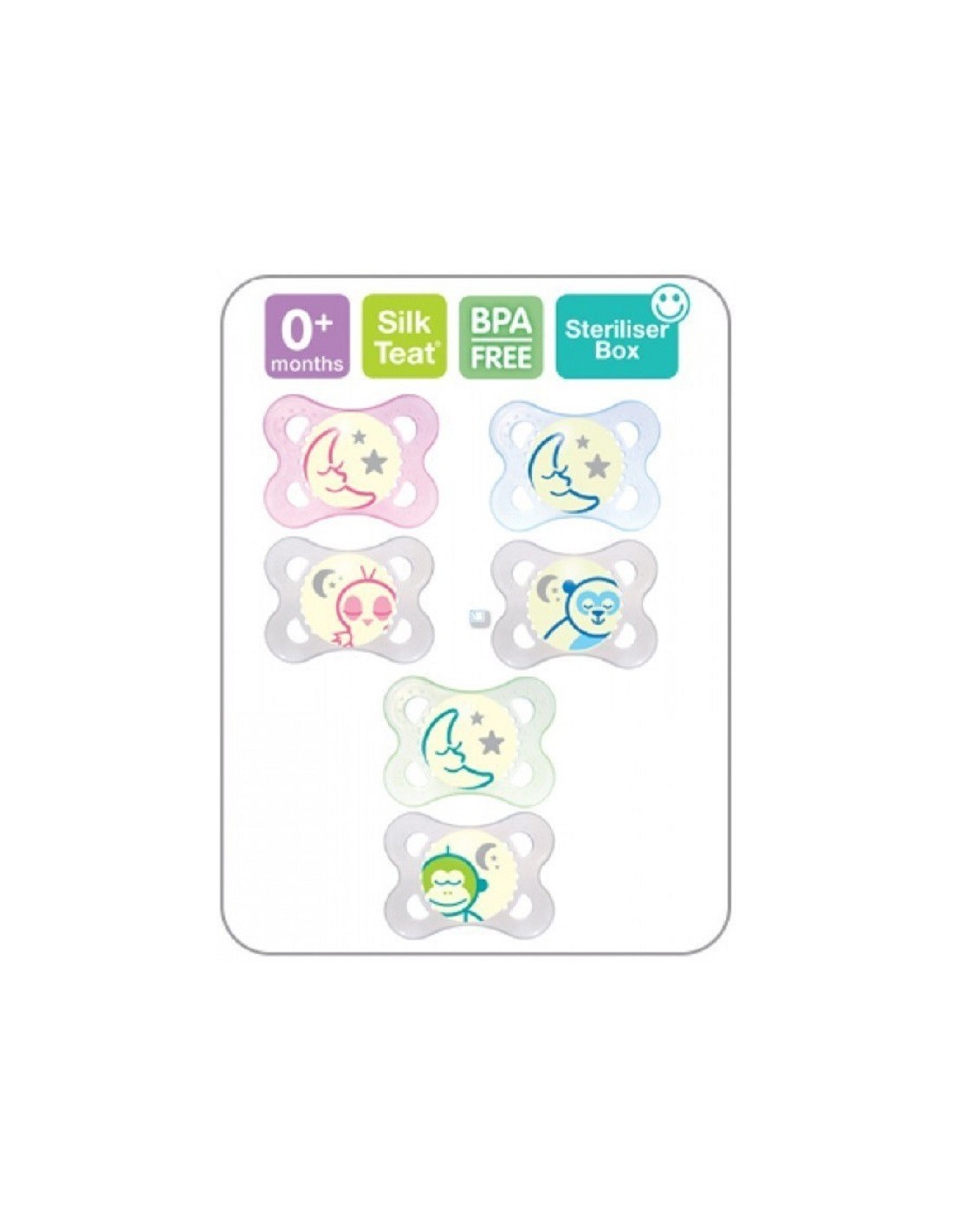 CHUPETE SILICONA MAM NIGHT 0- 6 M 2 U +CAJA ESTERILIZADORA